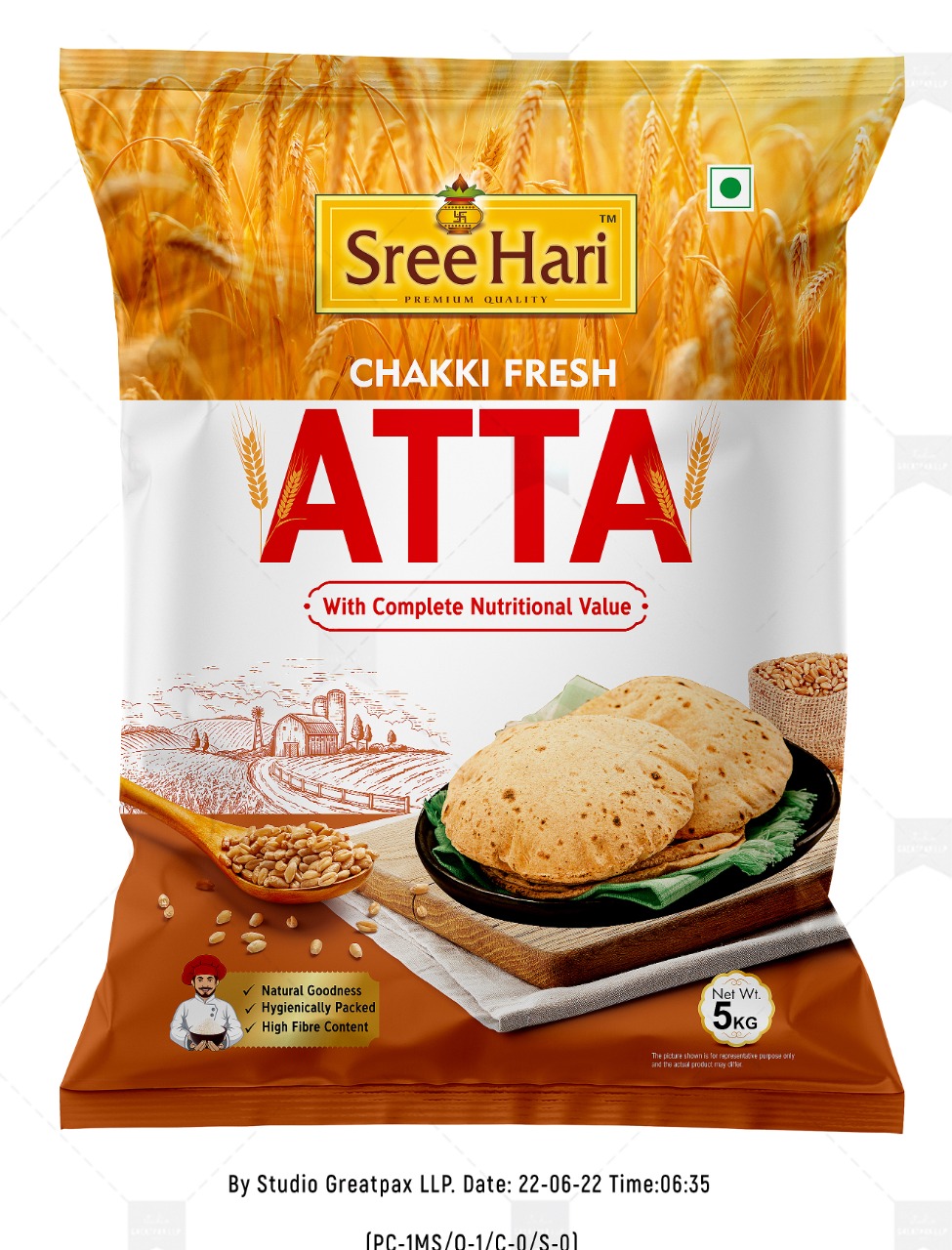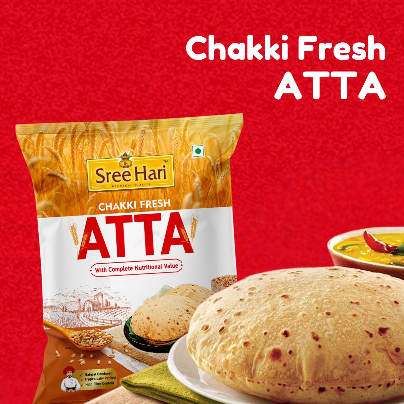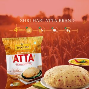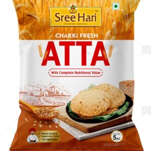 Chakki Fresh Atta – Sree Hari brings you the perfect blend of purity, nutrition, and authentic taste straight from the fields to your kitchen. Crafted from high-quality wheat grains, this atta is processed using the traditional chakki grinding method, which helps retain essential nutrients, natural fiber, and wholesome flavor.